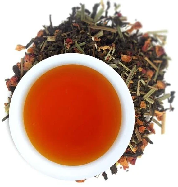 Organic assam tea, organic lemongrass & organic rose petals.
